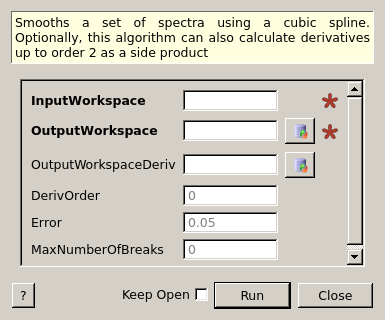 Smooths a set of spectra using a cubic spline. Optionally, this algorithm can also calculate derivatives up to order 2 as a side product