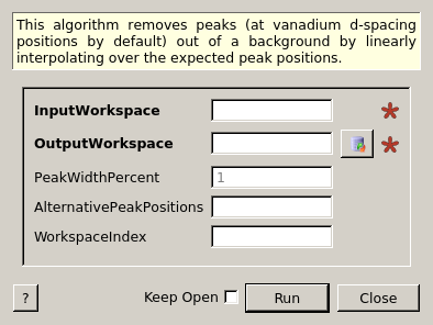 | WorkspaceIndex | Input | number | Optional | If set, peaks will only be removed from this spectrum (otherwise from all) |