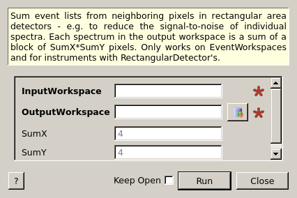 Sum event lists from neighboring pixels in rectangular area detectors - e.g. to reduce the signal-to-noise of individual spectra. Each spectrum in the output workspace is a sum of a block of SumX*SumY pixels. Only works on EventWorkspaces and for instruments with RectangularDetector’s.