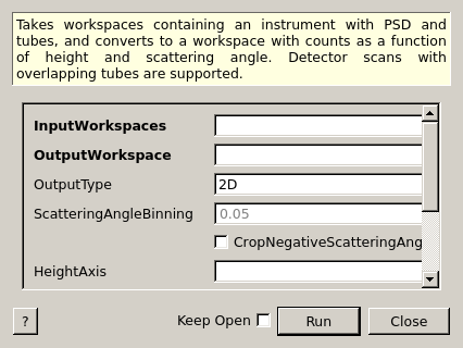 This algorithm takes an input workspace, a group workspace or a selection of workspaces, with a PSD tube instrument, and converts the workspace to a one or two-dimensional workspace of counts as a function of height and scattering angle. There are options to either see the data as it is, or apply a correction to straighten the Debye-Scherrer cones.