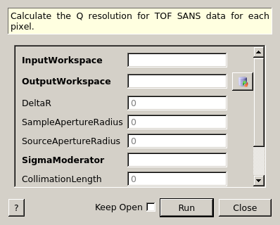 OutputWorkspace Output Workspace Mandatory Name of the newly created workspace which contains the Q resolution.
