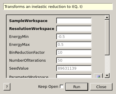 | ParameterWorkspace | Output | TableWorkspace | Table workspace for saving TransformToIqt properties | |