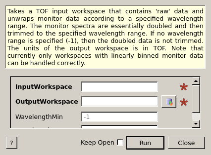 Takes a TOF input workspace that contains ‘raw’ data and unwraps monitor data according to a specified wavelength range. The monitor spectra are essentially doubled and then trimmed to the specified wavelength range. If no wavelength range is specified (-1), then the doubled data is not trimmed. The units of the output workspace is in TOF. Note that currently only workspaces with linearly binned monitor data can be handled correctly.