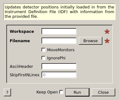 | AsciiHeader | Input | string | If the file is a simple text file, then this property is used todefine the values in each column of the file. For example: spectrum,theta,t0,-,RKeywords=spectrum,ID,R,theta,phi. A dash means skip column. Keywords are recognisedas identifying components to move to new positions. Any other names in the listare added as instrument parameters. | |