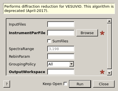 A version of ISISIndirectDiffractionReduction specific to use with VESUVIO (EVS) data, the reduction is performed in the same way however there is the additional option to load a PAR file.