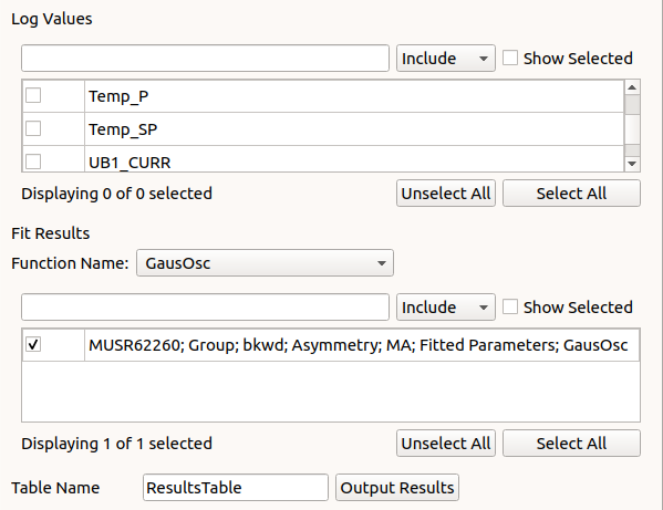 Lists log values from the fitted run(s) that can be selected to be output into the results table