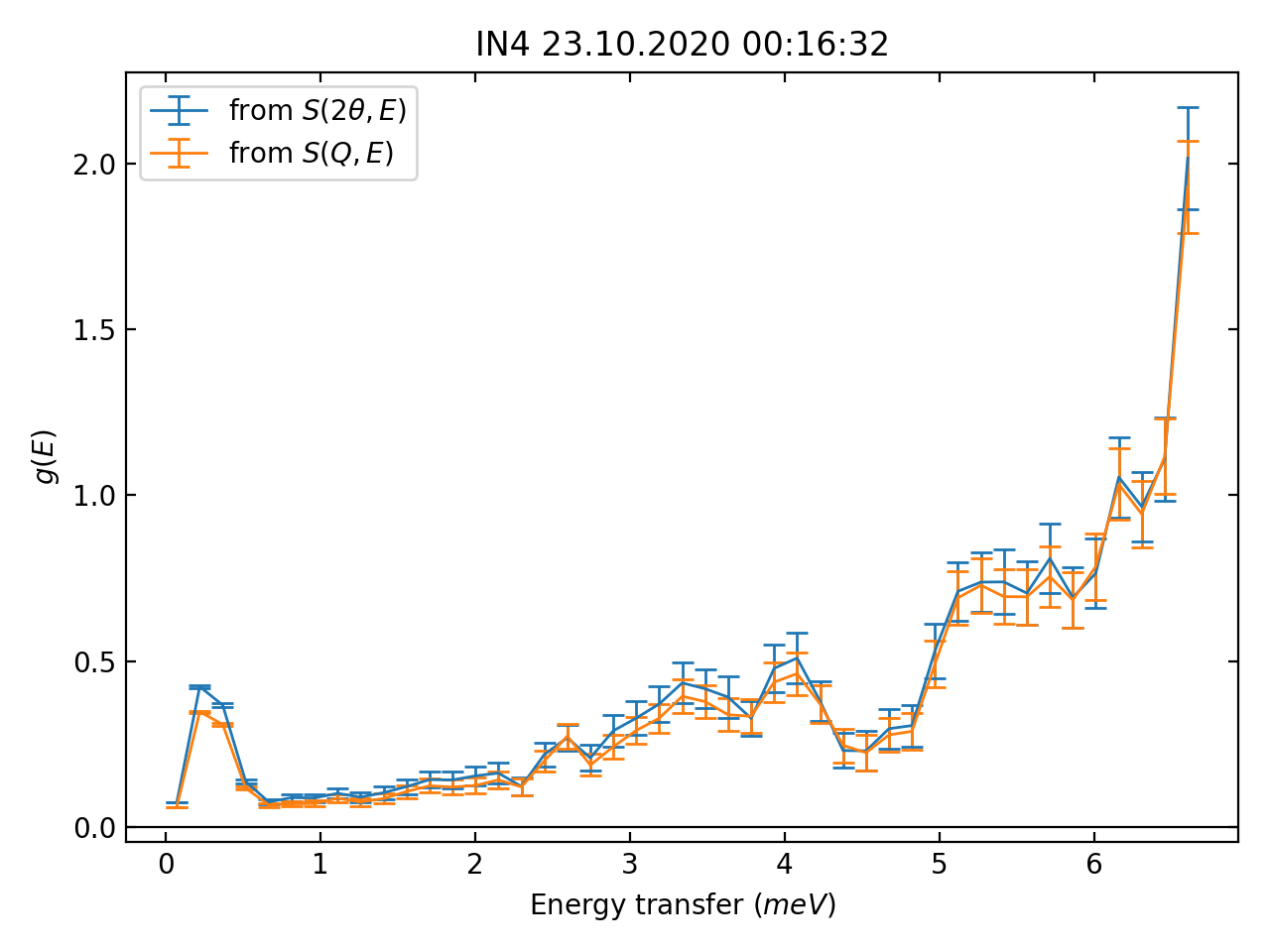 fig, axes = dt.plotDOS([dosFromStw, dosFromSqw], labels=[r'from $S(2\theta, E)$', r'from $S(Q,E)$'])