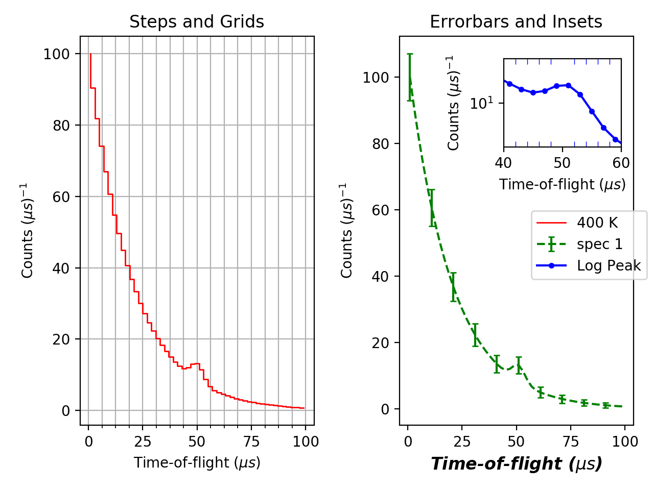 axes.set_xlabel('Time-of-flight ($\mu s$)'), axes.set_ylabel('Counts ($\mu s$)$^{-1}$')