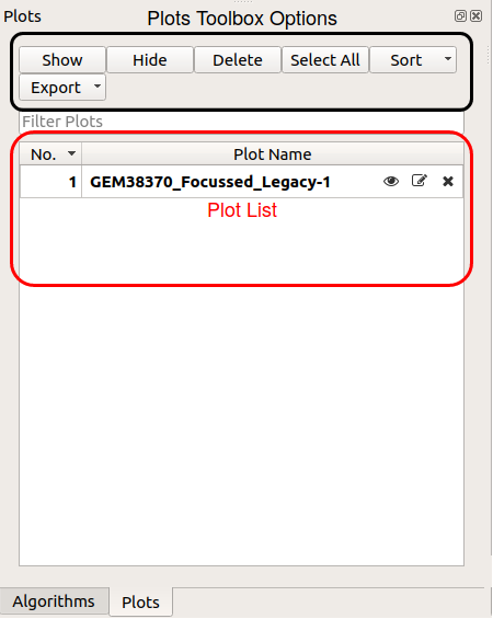This is a new concept in Mantid applications, the plots toolbox will encompass and display all currently open plots much like the workspace toolbox. It has options to hide, delete, or edit the name of each plot. All this can be done using the options buttons on top of the toolbox.