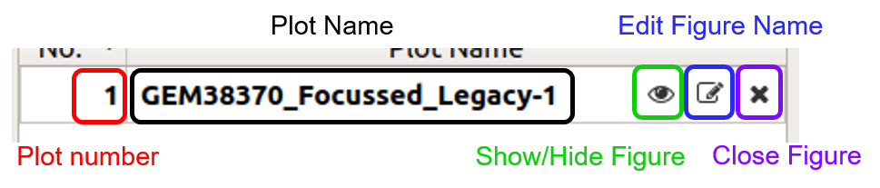 On each plot list item there are three buttons: “Show/Hide Figure”, “Edit Figure Name” and “Close Figure”. You can toggle the visibility of a plot using the “Show/Hide Figure” button. The “Edit Plot Name” option allows you to change the name of the figure in the plot list. The “Close Figure” option will delete the figure and remove it from the plot list, you cannot recover the figure after selecting this.
