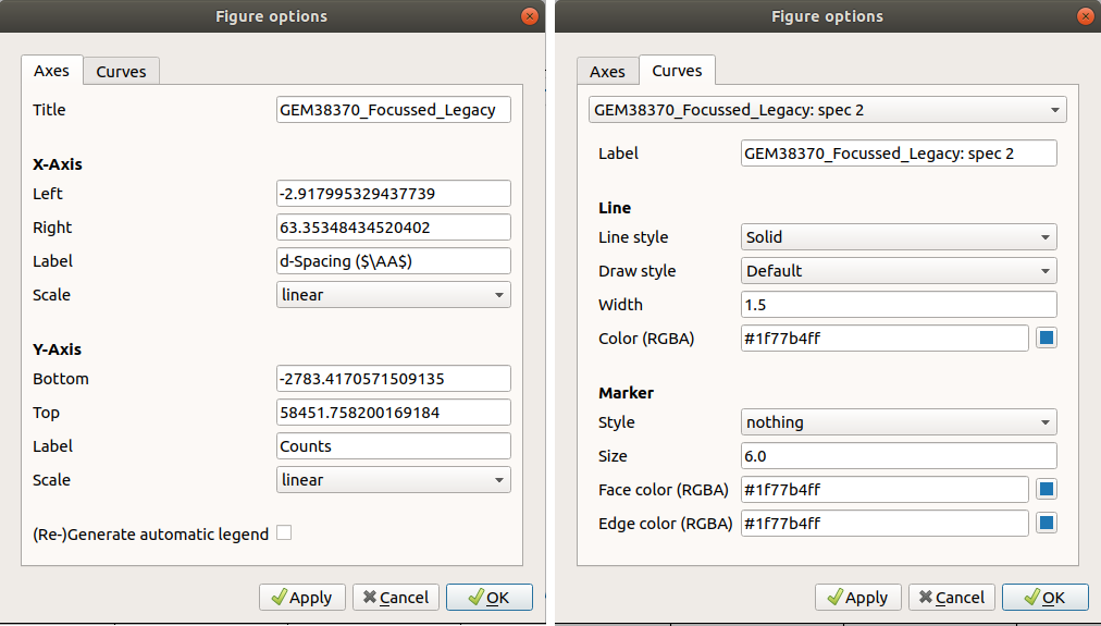 In the “Curves” tab you can change the properties of curves within your figure. The drop down menu at the top gives a list of the curves present in the figure, you can select the curve you want to modify. From here you can change the style and colour of the curve, as well as add point markers and change its label. To make sure the legend is updated ensure you have ticked the “(Re-)Generate automatic legend” box on the “Axes” tab.