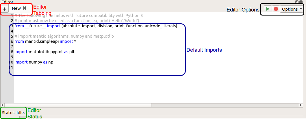 The script window is another key part of the Workbench. The script window is used to write or load python scripts that integrate with the Mantid framework and operate on data loaded within the Workbench. The window contains a status bar, multiple tabs for scripts, run and abort buttons and an options menu.