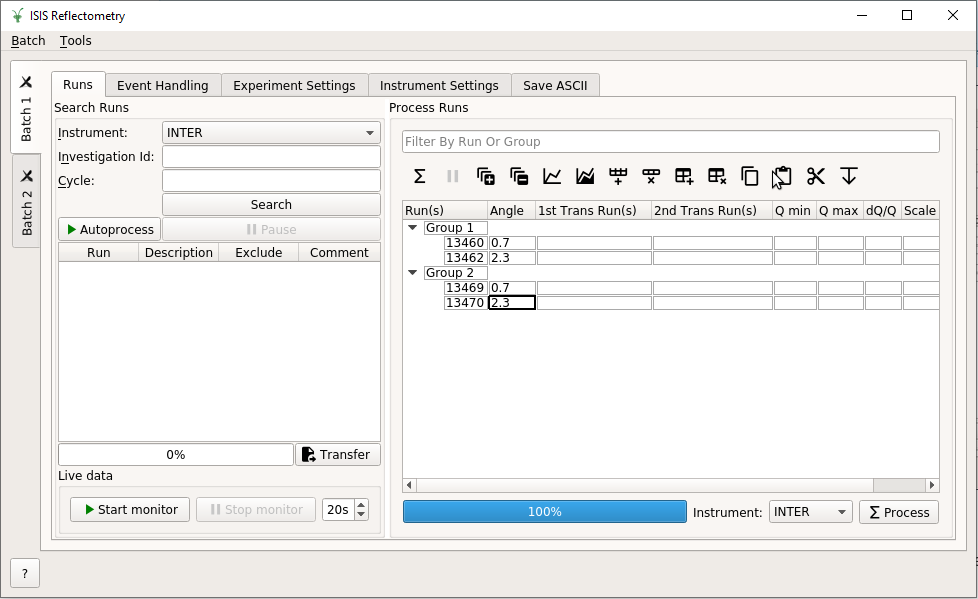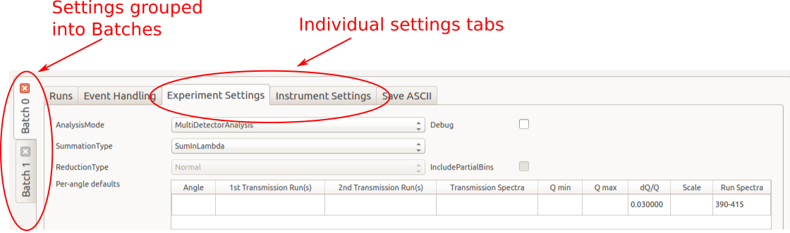 Batch tabs on the left contain all of the reduction settings for a particular batch of runs¶