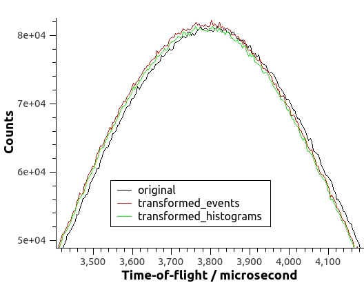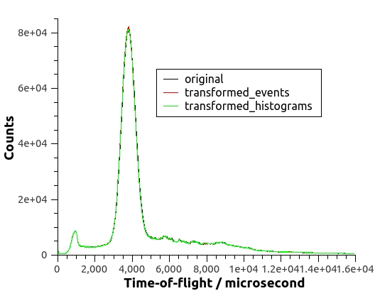 Here’s the result of applying ModeratorTzero to both the event list and the histogrammed data of a run in the VISION beamline. The transformation of either events or histograms shifts the curve to smaller TOF’s. The transformed curves are not supposed to be identical, but similar and differentiated from the original curve.