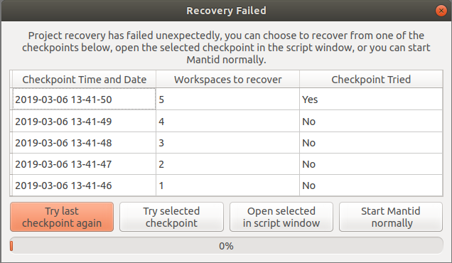 If Project Recovery fails to run successfully it will open a GUI that will give users the option to select a specific checkpoint, try the last checkpoint again, open a specific checkpoint in a script window or start mantid normally without any project recovery occuring. (See image)