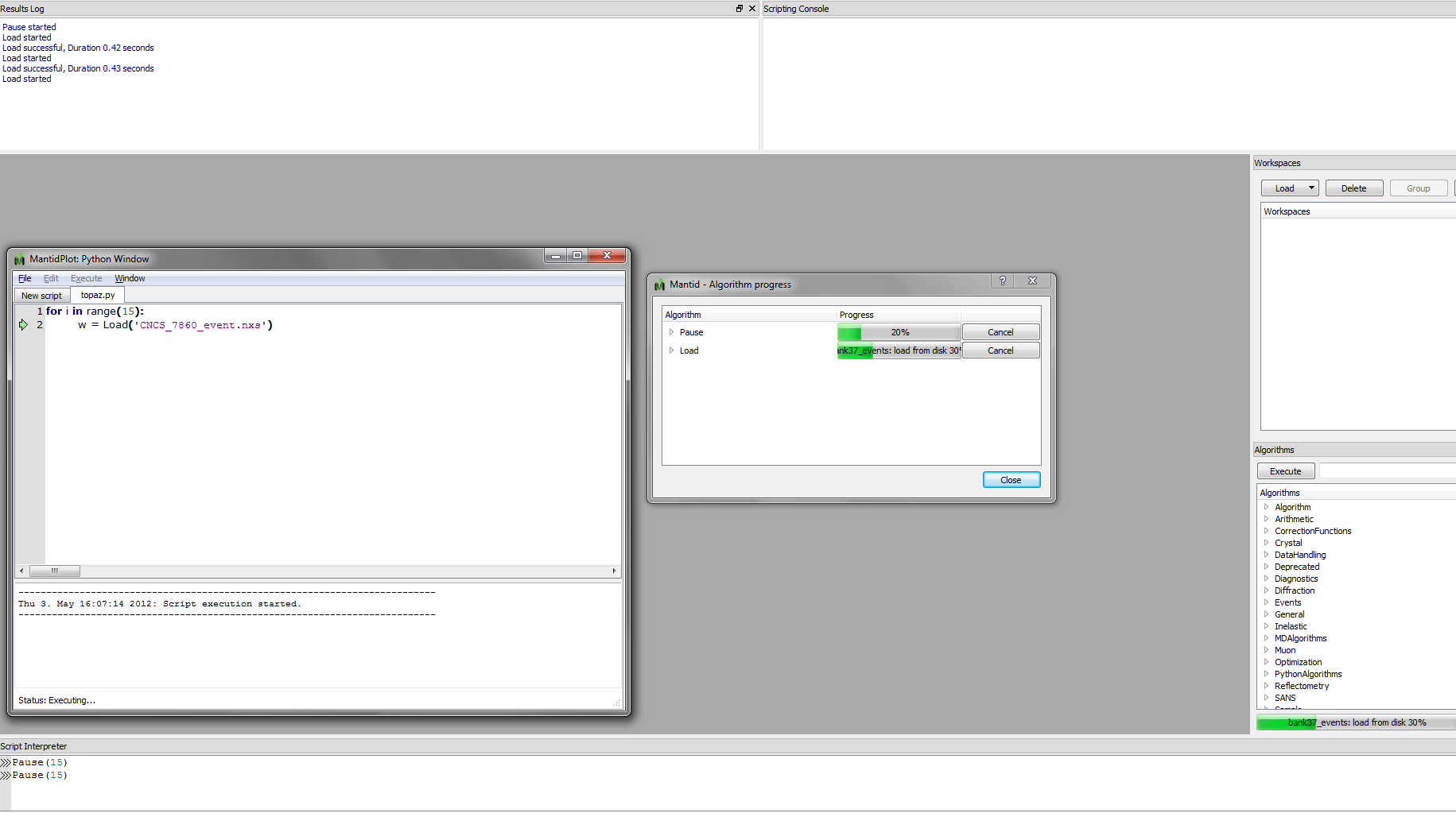In what follows, it will be shown how you can use some of these examples. Mantid needs to know where the files are in order to execute these examples. For Merlin the examples uses the run 12024 found in cycle_11_5, for MAPS the run 14919 in cycle_09_05, for WISH the run 17701 in cycle_11_1.
