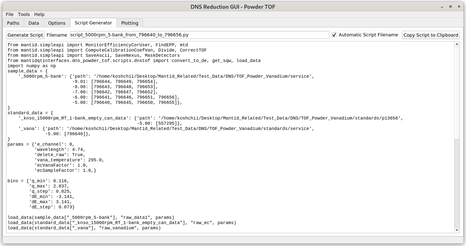 Running of the script can be aborted, by clicking the Abort Loading button, but then the data will not be displayed under the Plotting tab. The displayed script window cannot be edited inside the GUI, but can be copied to the clipboard using the Copy Script to Clipboard button and redacted elsewhere.