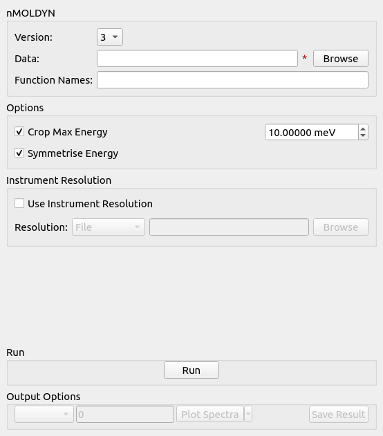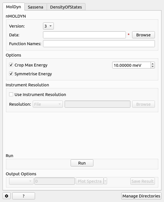 The MolDyn interface is used to import simulation data created using nMOLDYN (by using the MolDyn algorithm), tab operates on either .dat or .cdl files for nMOLDYN 3 or a directory containing the files extracted from the .tar archive created by nMOLDYN 4.