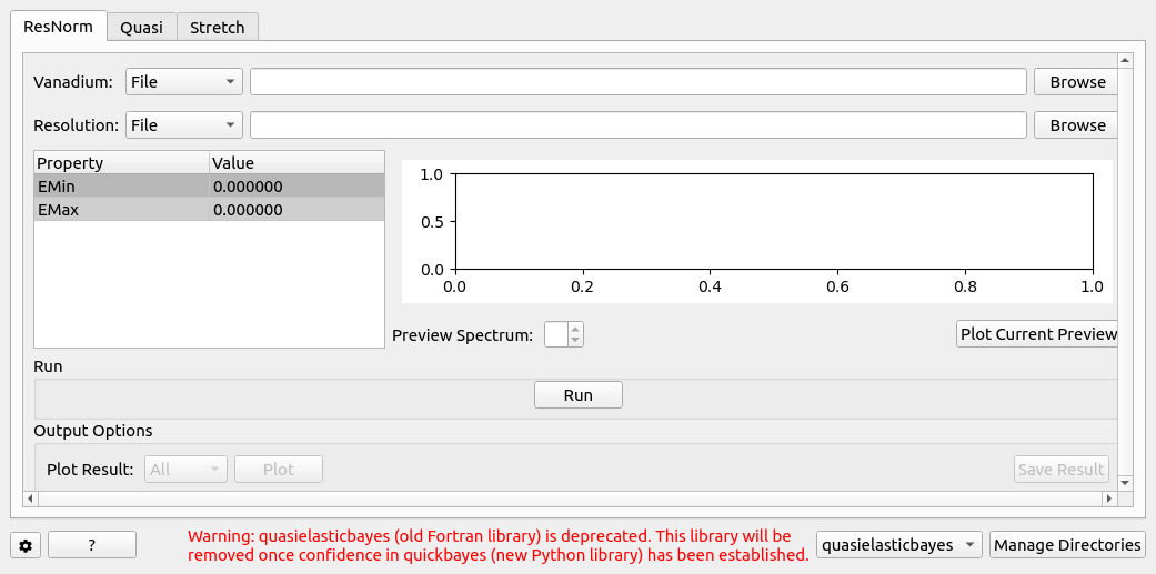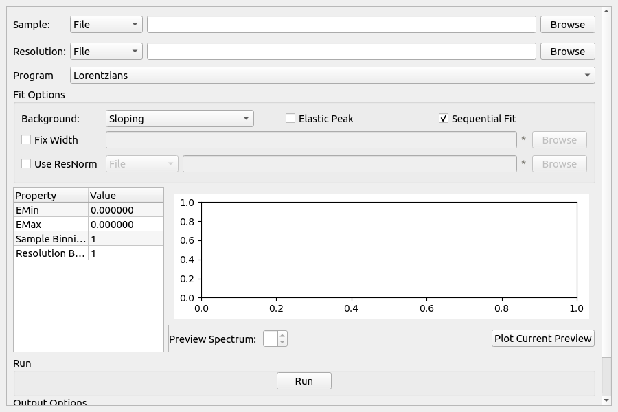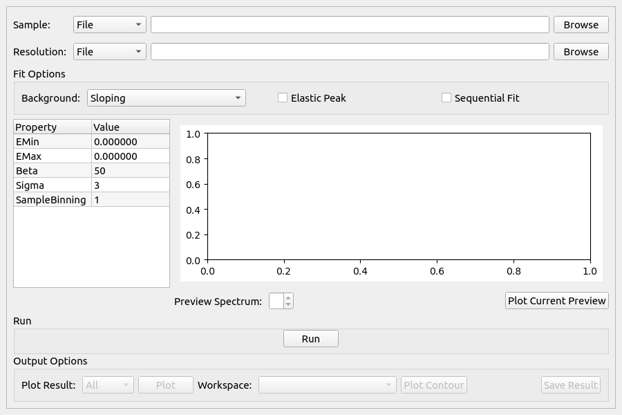 For a Lorentzian, the Fourier transform does the conversion: \(1/(x^{2}+\delta^{2}) \Leftrightarrow exp[-2\pi(\delta k)]\). If \(x\) is identified with energy \(E\) and \(2\pi k\) with \(t/\hbar\) where t is time then: \(1/[E^{2}+(\hbar / \tau)^{2}] \Leftrightarrow exp[-t /\tau]\) and \(\sigma\) is identified with \(\hbar / \tau\). The program estimates the quasielastic components of each of the groups of spectra and requires the resolution file and optionally the normalisation file created by ResNorm.