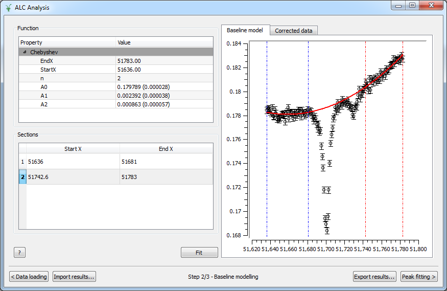In the Baseline Modelling step, the user can fit a baseline by selecting which sections of the data should be used in the fit, and what the baseline fit function should be. To select a baseline function, right-click on the Function region, then Add function and choose among the different possibilities. Then pick the desired fitting sections by right-clicking in the Sections area as many times as sections to use. Sections are also displayed on the Baseline model graph and can be easily modified by clicking and dragging the corresponding vertical lines.