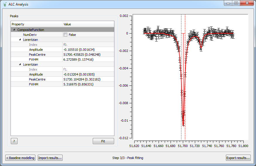 In order to extract these parameters accurately from an ALC spectrum it is necessary to determine a baseline, perform a baseline subtraction and then fit the peaks. The Muon ALC interface integrates this sequence of operations hiding the complexity of the underlying algorithms.
