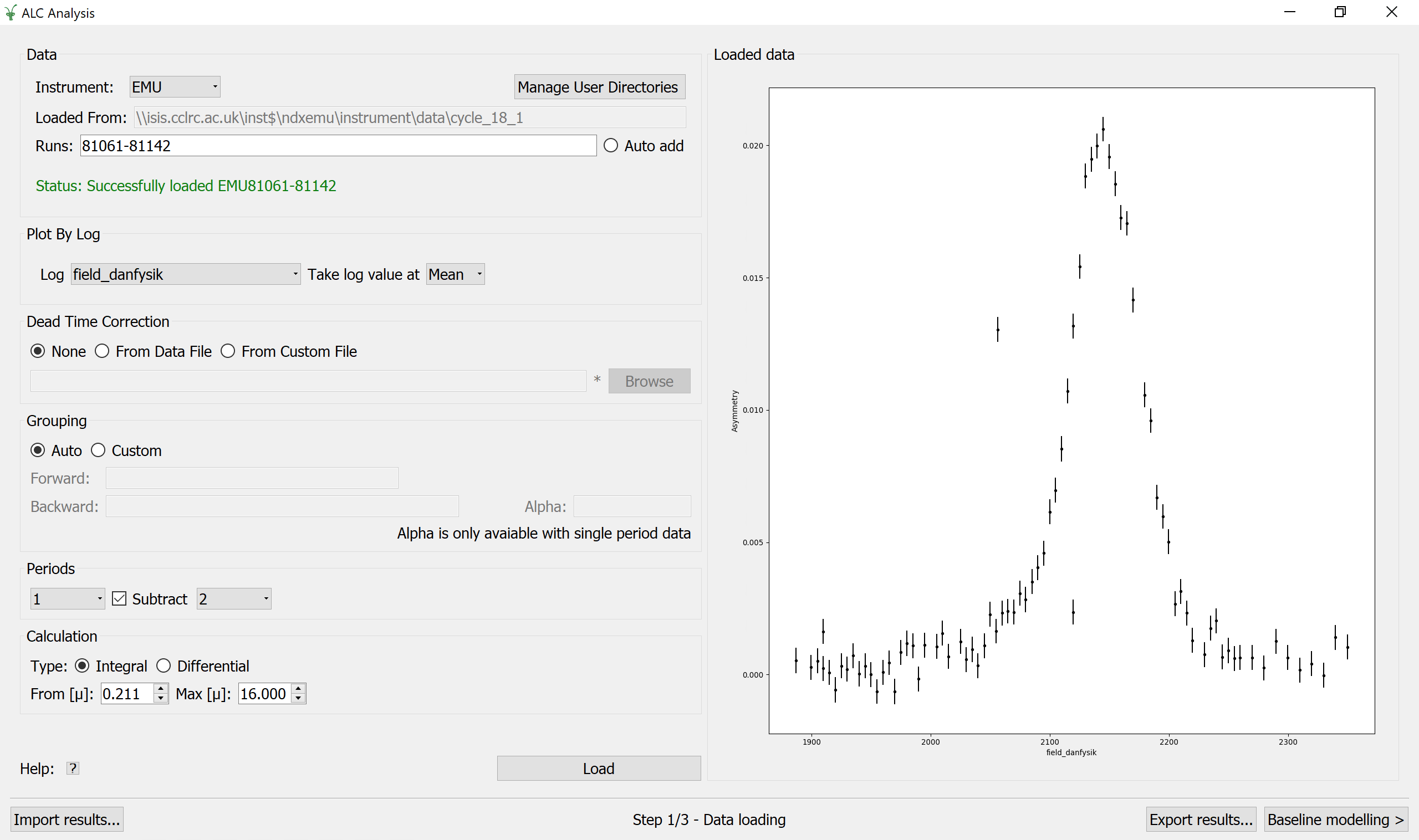 The input files must be Muon Nexus files with names beginning with at least one letter and followed by a number. In addition, the user must supply the Log data that will be used as X parameter from the list of available log values. Some additional options may be specified: the Dead Time Corrections, if any, can be loaded from the input dataset itself or from a custom file specified by the user. The detector Grouping is defaulted to Auto, in which case the grouping information is read from the run data, although it can be customized by setting the list of spectra for the forward and backward groups. Alpha (the balance parameter) is defaulted to 1.0 and can only be changed when analysing single period data.The user can also choose the Period number that corresponds to the red period, and the number corresponding to the green period, if the option Subtract is checked, and finally the type of Calculation together with the time limits. A click on the Load button results in the calculation of the asymmetry, displayed on the right panel.