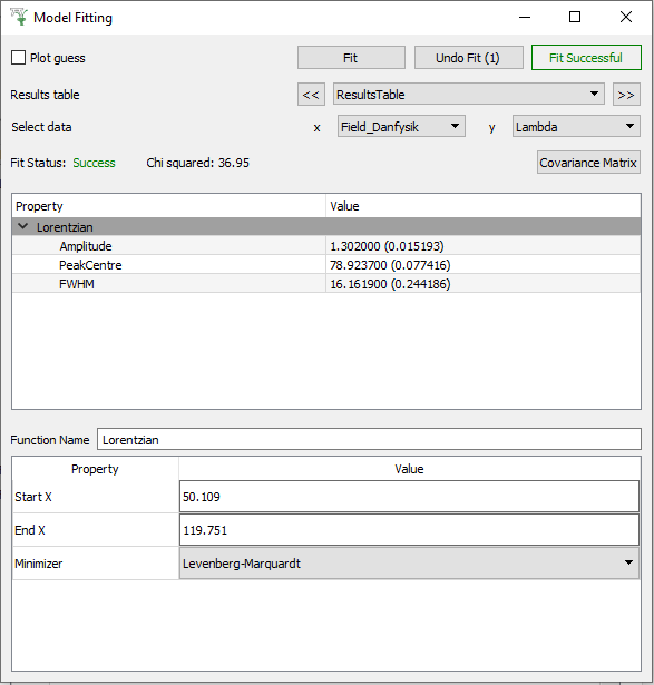 Covariance Matrix Opens the normalised covariance matrix for the currently selected fit domain.