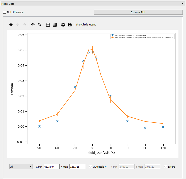 The model fitting tab is used to perform a fit across fit parameters and sample logs found in a results table within the Muon Analysis and Frequency Domain Analysis. To use Model fitting it must first be enabled via the feature flags. This tab allows you to select a results table, before selecting the data that should be plotted on the x and y axes. It is then possible to perform a fit using a selected fit function. The selected model fit data is displayed in a plotting pane on the right hand side of the interface. An example model fit plot is seen in the image below.