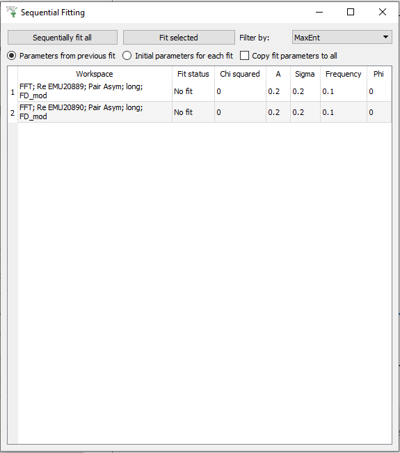 This tab allows the user to perform sequential fits. The sequential fits are based on the fit function specified in the fitting tab. The primary widget in this tab is the Fit Table, which is automatically generated based on the selected Groups/pairs and the fit function defined in the fitting tab.