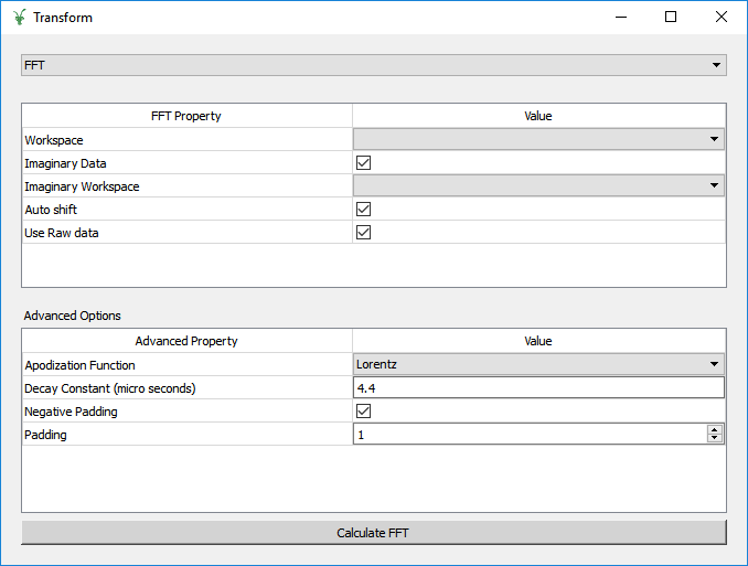 In this mode the interface displays two tables, FFT and Advanced options. The FFT table contains all of the information required to produce a forward FFT. The Advanced Options table contains the information for adding padding and apodization functions to the data.
