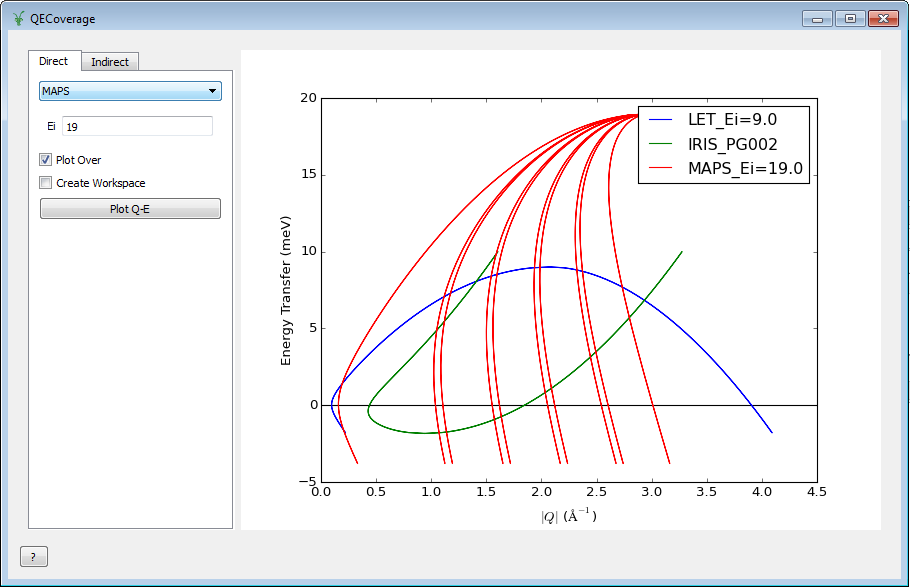 To use, select the geometry (direct or indirect) and instrument from the tabs and drop-down menu. For direct geometry spectrometers, an incident energy (Ei) in meV must be given; for indirect geometry machines, the final energies are fixed at a few values which must be selected from the drop-down menu. Only positive values of Ei are permitted. Several Q-E trajectories can be plotted simultaneously by providing several Ei values separated by commas.