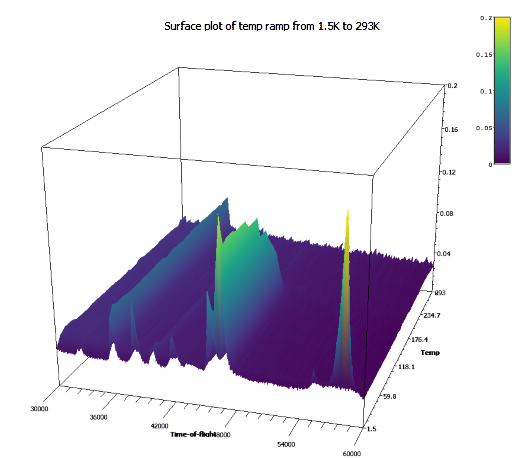 Surface plot of a temperature ramp from 1.5 to 293 Kelvin, recorded on WISH¶