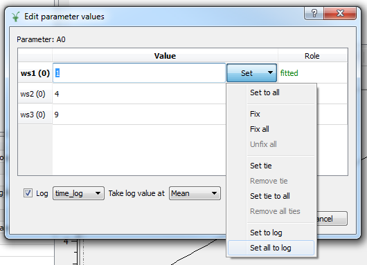 “Set to log” and “Set all to log” options have been added to the parameter editing dialog. These enable a parameter to be set to a value from a sample log for one or all spectra.