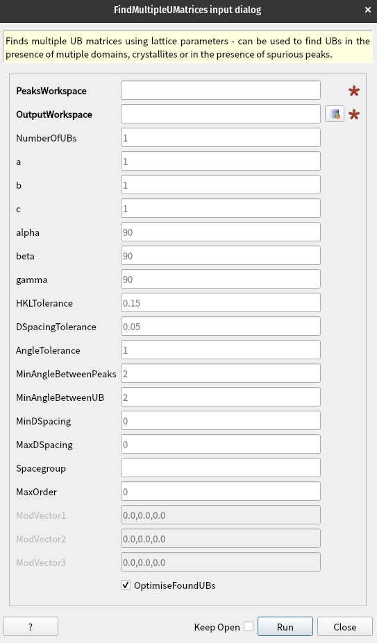 NumberOfUBs) of UB matrices (B is hard-coded due to the lattice parameters provided) and return a group of peak workspaces (one for each UB) containing the peaks that are indexed most accurately by that UB. The algorithm is useful for finding a single UB in the presence of spurious peaks, or finding multiple UBs when there are multiple domains.