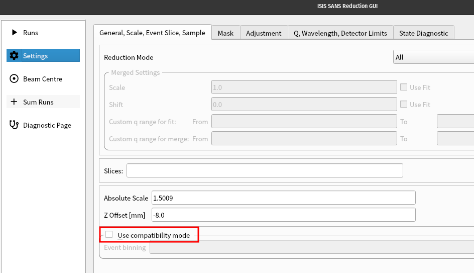 The Compatibility Mode feature in the ISIS SANS GUI is no longer selected by default. This feature should be considered deprecated and will be removed completely in a future release.