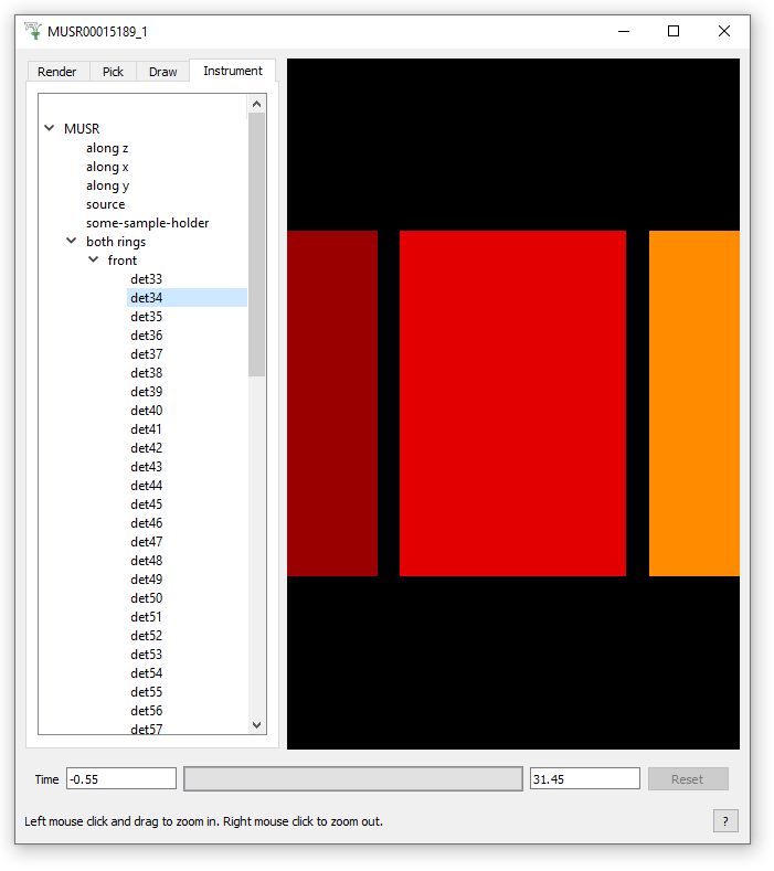 The Instrument Tree tab allows you to drill down into detector structure through detector banks to pixels. Select a part in the tree widget and the display will show only that component.