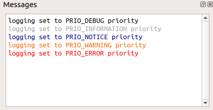 Any log message with a priority higher or equal to the selected level will be displayed. To distinguish between priority levels each one has an associated colour, as shown in the top-right figure.