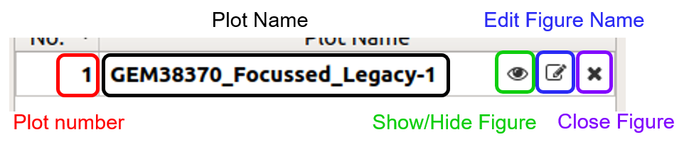 On each plot list item there are three buttons: “Show/Hide Figure”, “Edit Figure Name” and “Close Figure”. You can toggle the visibility of a plot using the “Show/Hide Figure” button. The “Edit Plot Name” option allows you to change the name of the figure in the plot list. The “Close Figure” option will delete the figure and remove it from the plot list, you cannot recover the figure after selecting this.