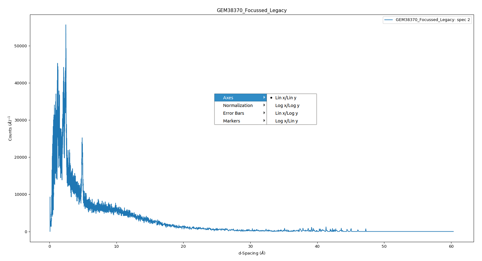 Plotting in Workbench is carried out using Python’s Matplotlib package. Matplotlib provides several advantages: it is a large library containing many features, it is also widely used which means there is excellent documentation available and plenty of examples to work from. You can create a plot either using Matplotlib within your scripts or right-clicking a workspace and selecting to plot.
