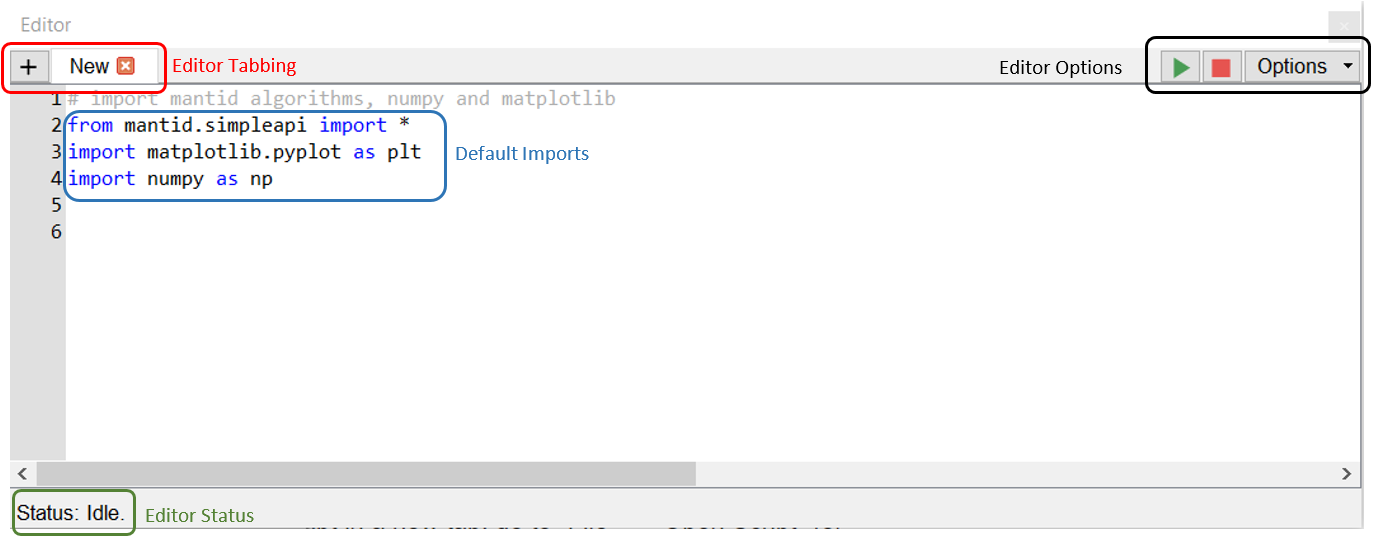 The script window is another key part of the Workbench. The script window is used to write or load python scripts that integrate with the Mantid framework and operate on data loaded within the Workbench. The window contains a status bar, multiple tabs for scripts, run and abort buttons and an options menu.