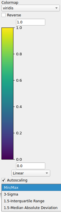Autoscaling options allow the colorbar limits to automatically be updated. There are several options to help “quickly” re-scale the limits. Some of the options are based on several statistical methods for determining outliers.