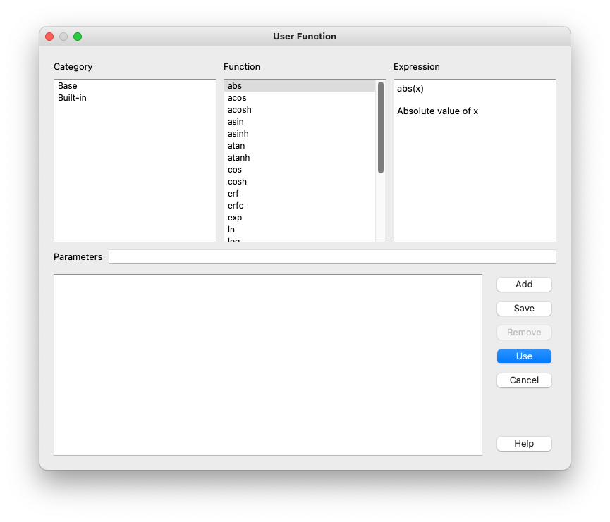 The lower half of the dialog contains a multi-line text editor for typing in and editing the formula. The formula must be a valid muParser expression and a function of single argument x. Any other variable is treated as a parameter. The parameters are automatically extracted from the formula and displayed in read-only text field “Parameters”.