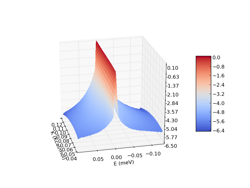 Interpolated structure factor \(S(K,E|Q)\), in logarithm scaling, at fixed \(Q=0.9A^{-1}\).