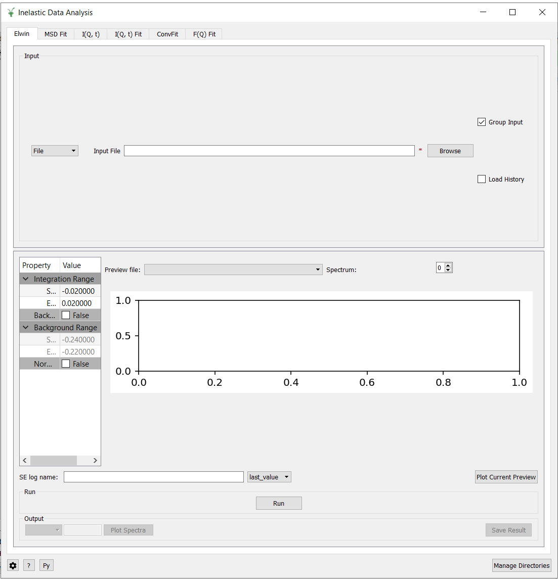 The majority of the functions used within this interface can be used with both reduced files (_red.nxs) and workspaces (_red) created using the Indirect Data Reduction interface or using \(S(Q, \omega)\) files (_sqw.nxs) and workspaces (_sqw) created using either the Indirect Data Reduction interface or taken from a bespoke algorithm or auto reduction.